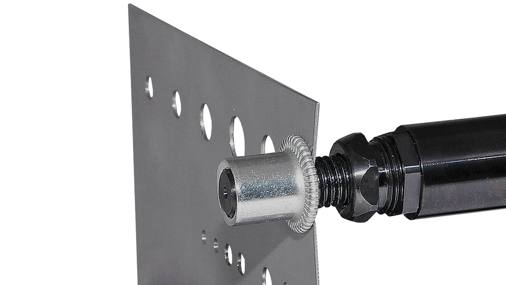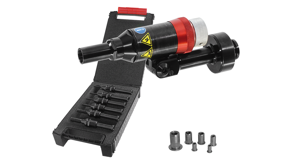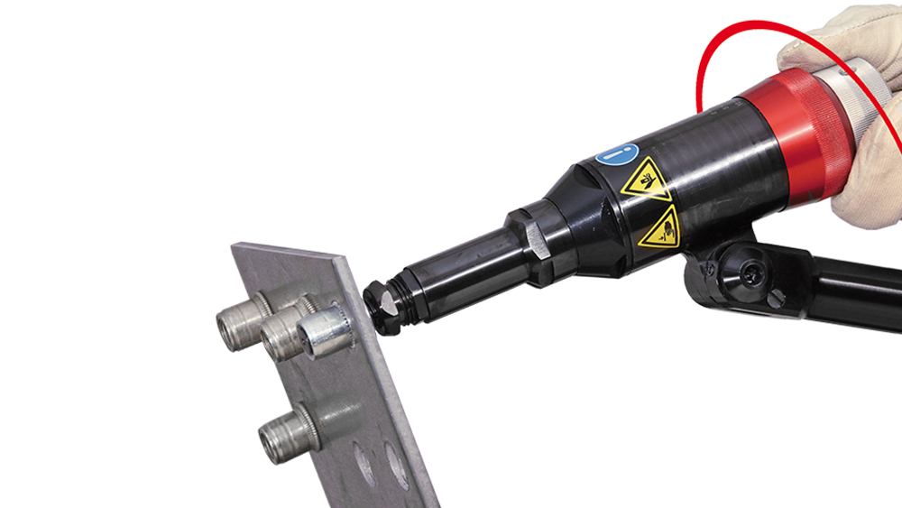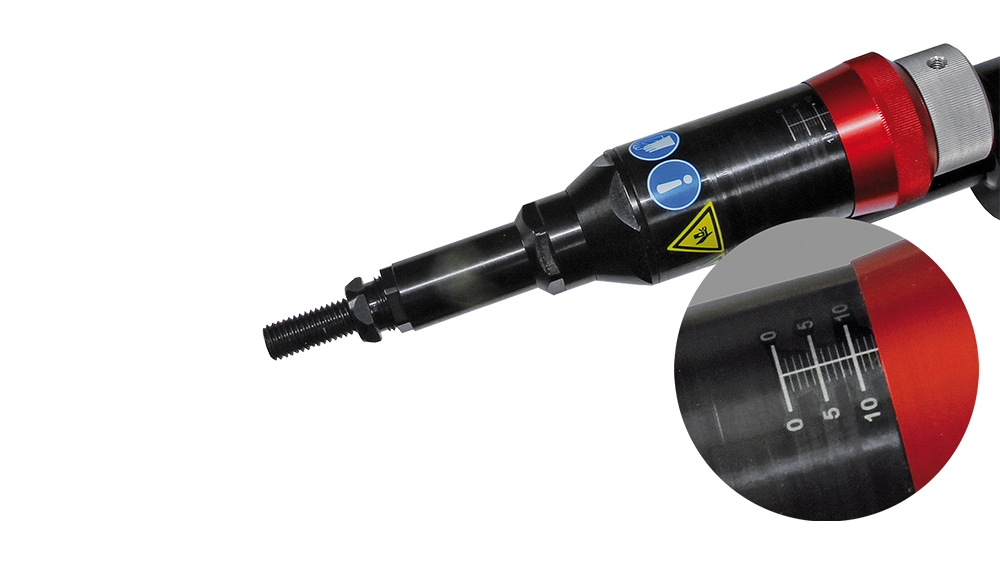 With stroke length setting, infinitely adjustable, perfect setting control. Pulling force 50 kN, free pivoting and rotating – for rivnuts M4-M12, bolts and studs, etc. Extremely good accessibility, all jobs effortlessly.