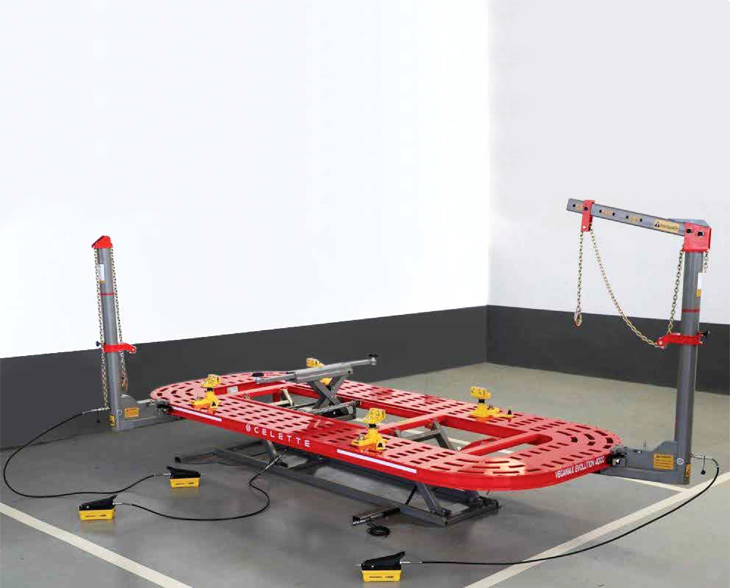 VEGAMAX Evolution 4000 is a straightening rack equipped with 2 pulling towers with hydropneumatic pumps, rams and chains, with the capability of 360 degree positioning around the rack.