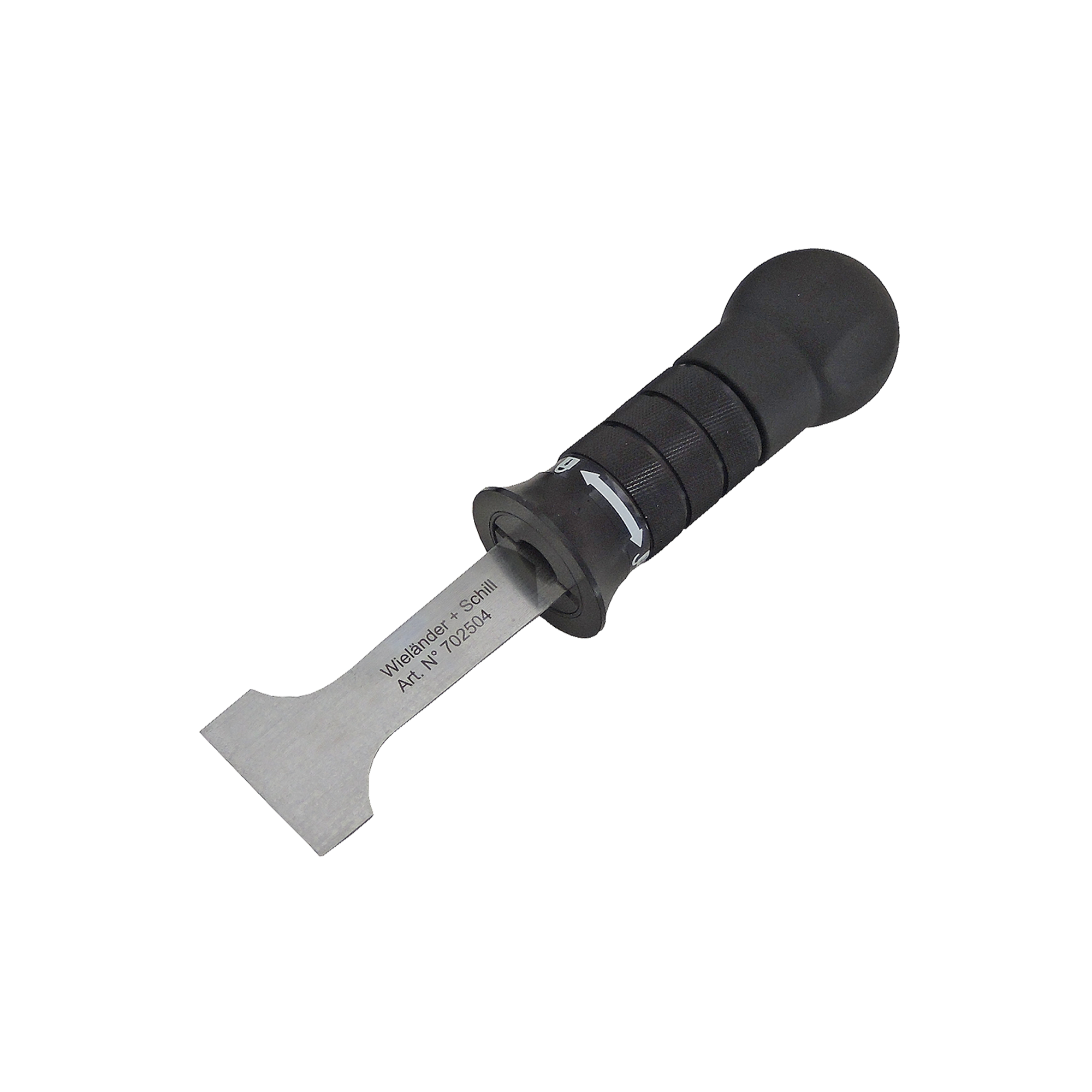 Removal of PU adhesives, glues and sealers under ambitious conditions and places, contour blades made out of cutlery steel – extremely sharpened, compact handle, comes with finger protector, blades for use on right and left sides including grinding stone for re-sharpening.